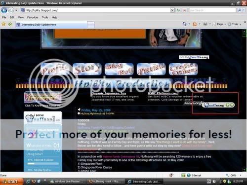 Woohoo! Next new thing gonna introduce to everyone is…..Nuffnang X change Widget!!! haha…i somehow pretty like the widget ar! lols..Morning woke up and i saw this X change thingy…Therefore i faster go copy the html code into my blog and guess what!? hoho, i successfully, make the different view between Internet Explorer (IE) and FireFox web browser. haha, So what the different? In IE view, My Nuffnang X change widget will just beside the google ads, However, in Firefox or safari view, it is beside my blog post…! *see the 2 image below*