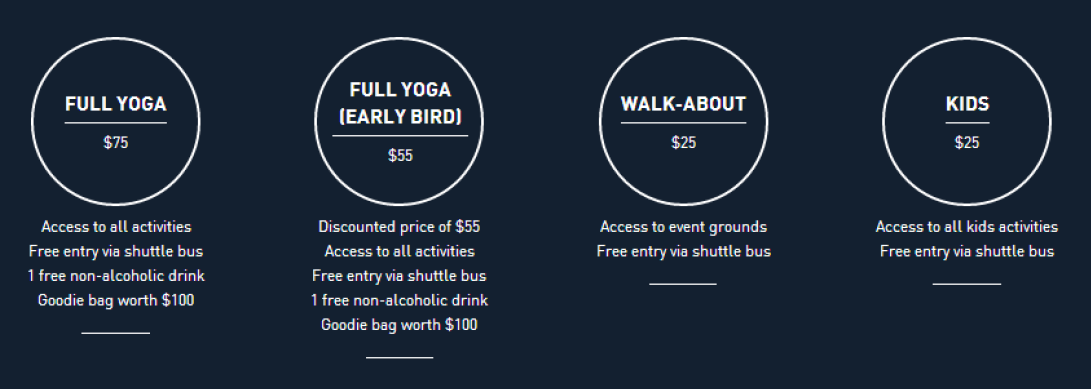 Tickets cost S$25 for walk-about passes and access to event grounds, and S$75 for Full Yoga passes, which cover access to all yoga sessions, fringe activities (subject to availability), a free non-alcoholic drink and goodie bag worth S$100. Ticketholders also enjoy free entry into Sentosa. The first 100 to arrive will receive premium sports water bottles worth $25 each.